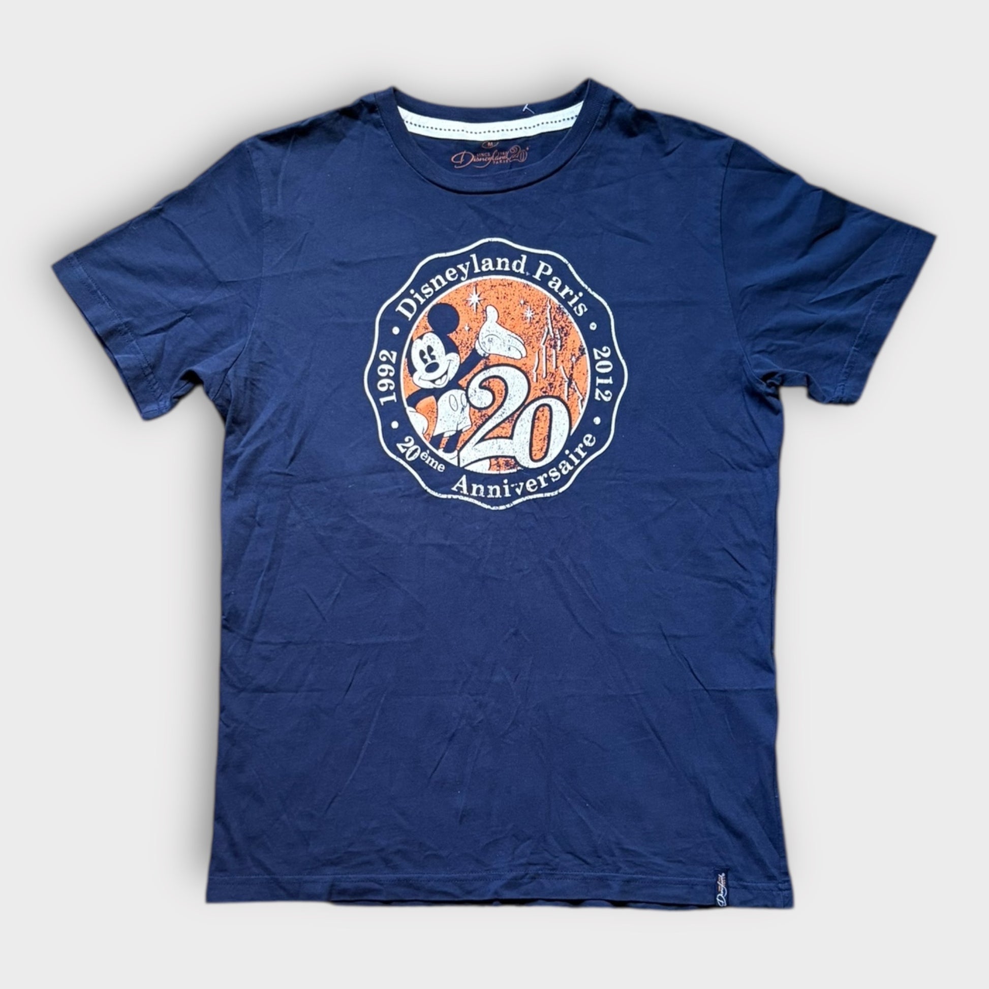 The Disneyland Paris 2012 20th Anniversary Tee is a commemorative clothing item featuring the iconic Mickey Mouse character from the Disney franchise. This contemporary piece was released in 2012 to celebrate the 20th anniversary of Disneyland Paris, making it a collectible item for Disney enthusiasts. The tee is a must-have for fans of Disney and Mickey Mouse, showcasing the timeless appeal and nostalgia associated with the beloved brand.
